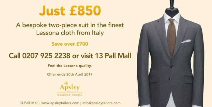 This week is your last chance to get a bespoke Apsley/Scabal suit for only £980 – saving you £600. The finest Apsley bespoke suits in five superb, handpicked Scabal fabrics are just £980 this June.